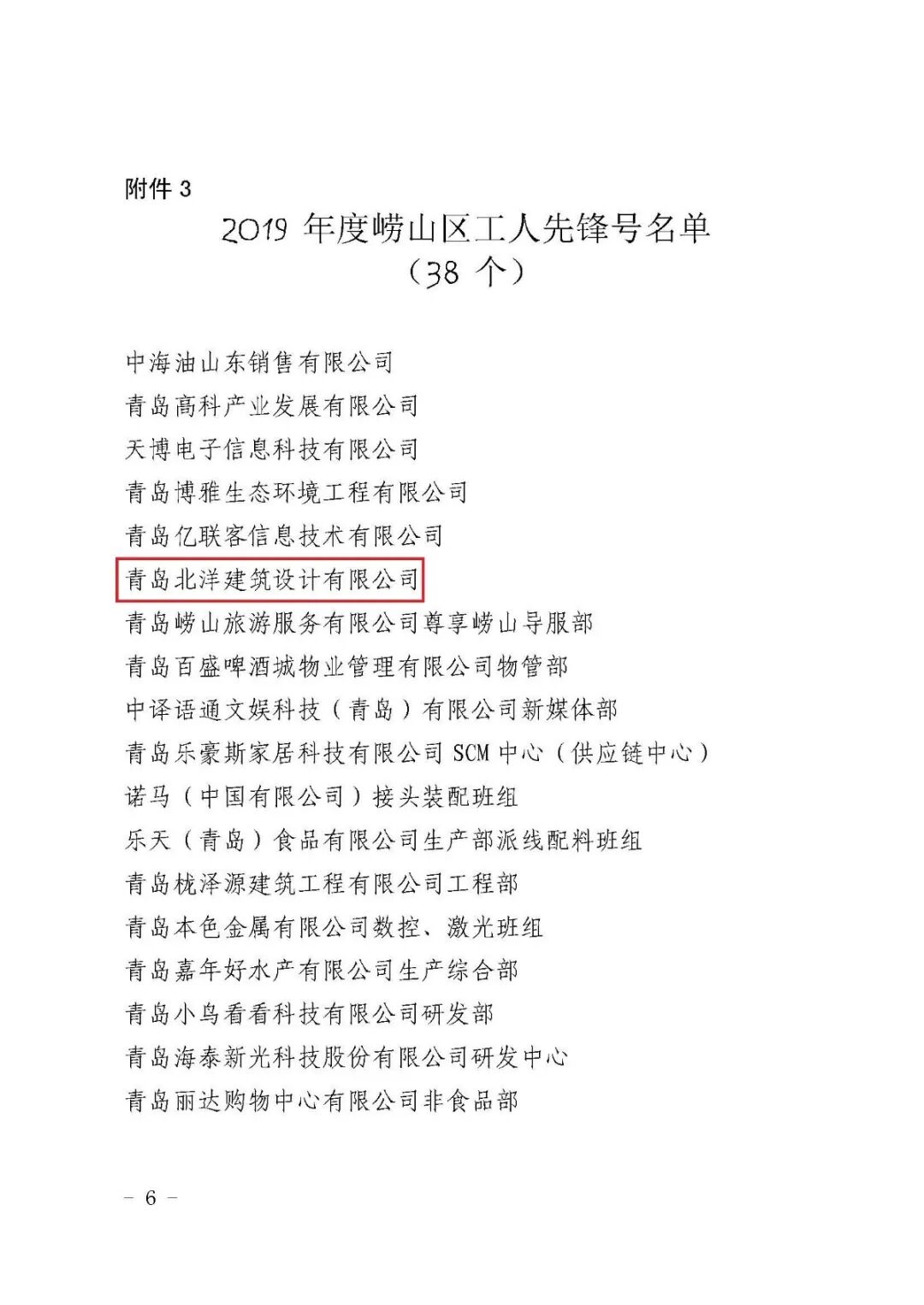 日前,青岛市崂山区总工会公布了《关于命名崂山区2019年度“工人先锋号”和“工人先锋”的通报》。其中,北洋设计荣获2019年度崂山区“工人先锋号”称号。