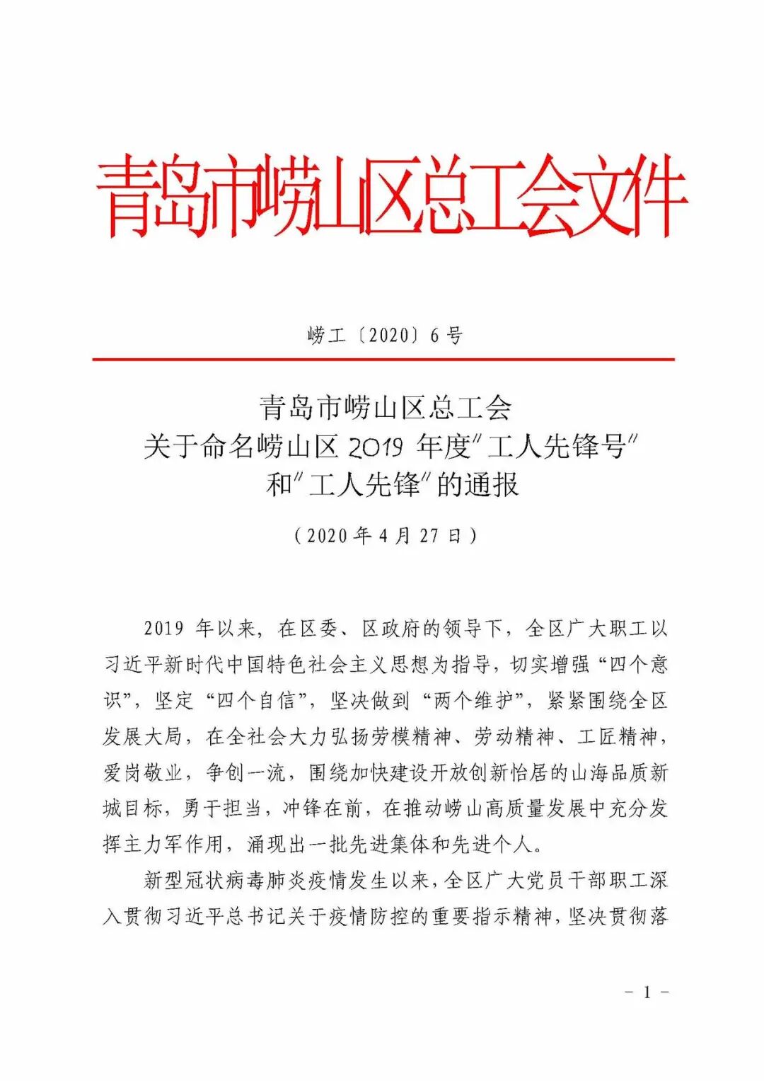 为在全社会大力弘扬劳模精神、劳动精神、工匠精神,切实发挥先进典型的示范引领作用,激励全区广大职工爱岗敬业,争创一流,青岛市崂山区总工会命名了49个先进集体为崂山区“工人先锋号”。在此特殊时期,北洋设计获此殊荣,是上级领导部门对北洋设计持续拼搏,努力奋斗精神的肯定和支持;同时,也得益于公司党委和工会组织的工作支持。
