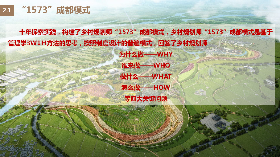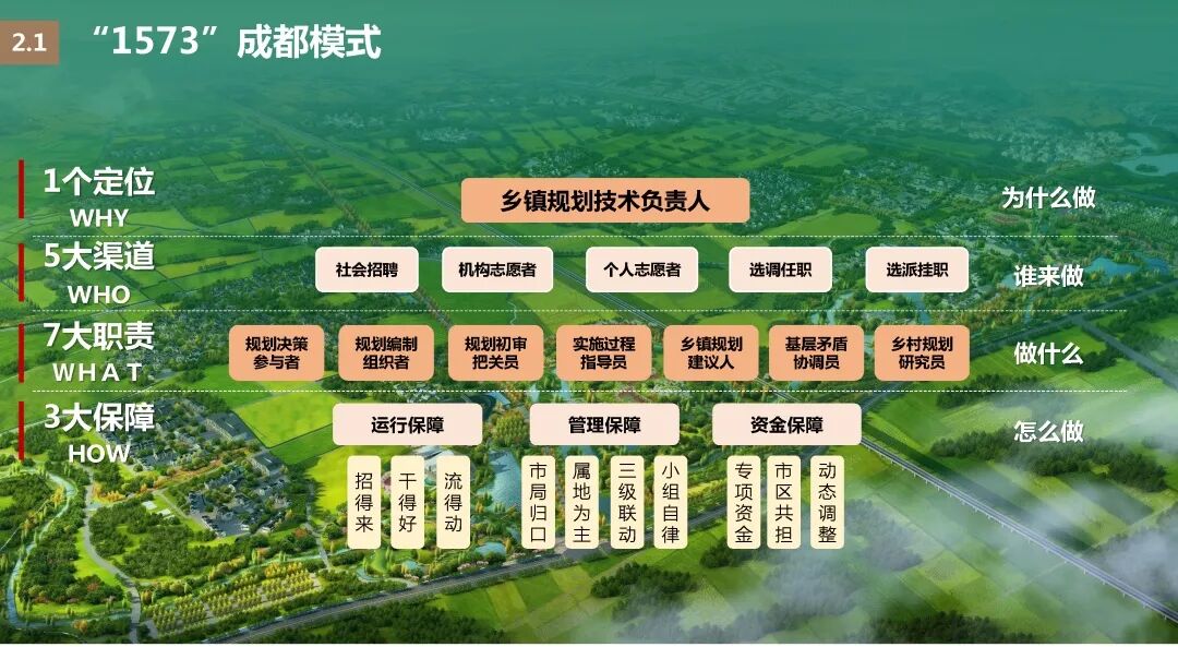 所谓“1573”,即1个定位、5大渠道、7大职责、3大保障的整套“成都模式”,基于管理学“3W1H”方法的思考,按照制度设计的普遍模式,明确了乡村规划师制度,为什么做、谁来做、做什么、怎么做。