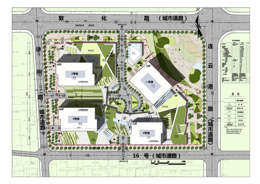 拟建一号楼58层高度250米,主要用途为办公楼,二、三号楼40层高度160.15米,主要用途为小型办公公寓楼;四号楼23层高度100米,主要用途为小型办公公寓楼,四层裙房商业,总高24.8米,面积60684平方米;设四层大底盘式地下室(地下车库、商业)。