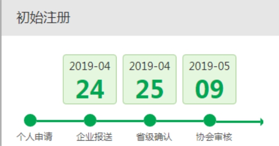 单位报送后需经过省级确认、协会审核、证书寄出三个环节方可完成全部初始注册流程,可登录单位账号查询业务办理进度。